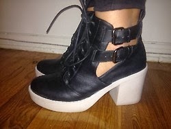 So recently I've purchased these fabulous boots from BooHoo.com and I love them so much! They are the similar of the Topshop Aftershock boots that was been seen on Danielle Bernstain, Eleanor Calder, and Demi Lovato! They have the perfect cut outs and the comfort is unbelievable! I believe that these are very true to size! I ordered a 9 since I'm an 8 1/2 but sadly boohoo doesn't sell half sizes so I had to get a 9, it is a bit roomy but it's not the uncomfortable type of large it's the perfect type of room between your toe and the top of your shoe! The heels on these boots are 8.5cm which is 3.25in so they are a bit higher than the aftershocks BUT THEY DON'T HURT! I actually feel like I love these more than the Aftershocks just because it has two buckles instead of one! I wore this to school today and my date and can I just the amount of compliments that I've gotten from girls AND guys is complete mad! They are so versatile, you can wear them in literally every single season! The only downfall to the shoes are, because the bottom is white it does stain quickly but nothing like a damp paper towel can't fix and the back started hurting a bit but that's only because I tightened the buckles too tight!